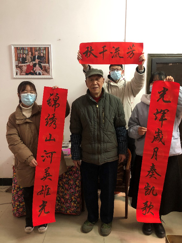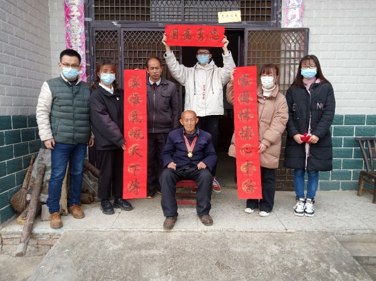 实践团队严格遵守当地疫情防控的规定,在麻城市老干局、党史办、乘马岗镇政府的协助下,先后看望慰问了抗战老兵龚敬堂、江乐修、抗美援朝老兵丁永念、离休退役干部卢则喜、邢元三、孙洪禄等。永利yl23411集团的教师与员工代表将一幅幅带着浓浓年味的对联交到了每一位老兵的手上,在新春佳节来临之际为他们送上了新年最真挚的问候。这一幅幅春联不仅营造了新春佳节的节日气氛,更表达了莘莘学子对老兵的敬仰与尊重。93岁高龄的退役老兵邢元三激动地表示,感谢党和各位师生对老兵的关爱,让我们在寒冷的冬天感受到了春一般的温暖。