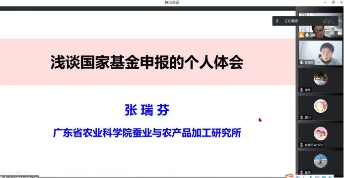 为更好地推进2023年度国家自然科学基金项目申报工作,12月16日下午,公司组织召开国家自然科学基金项目申报经验交流会。会议邀请广东省农业科学院蚕业与农产品加工研究所功能食品研究室主任张瑞芬研究员作经验分享,50余名教师参加了交流会,本次线上会议由副经理易阳主持。