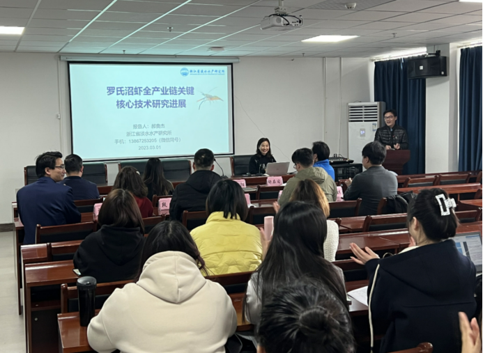 会议上,郝贵杰研究员首先开展了题为“罗氏沼虾全产业链关键核心技术研究进展”的学术报告。报告就浙江省水产研究所的发展历史及罗氏沼虾的全产业链商业化推广做出讲解,系统介绍其研究团队在罗氏沼虾生产方面取得的重要研究进展。对罗氏沼虾的传统产业升级,育种提优的方法挖掘,以及数字化商业应用研究进行介绍,并与在座师生进行深入交流互动。