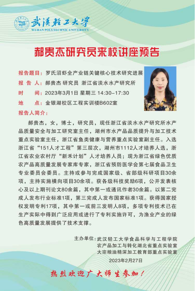 3月1日下午,现任浙江省淡水水产研究所水产品质量安全与加工研究室主任、湖州市水产品品质提升与加工技术重点实验室主任郝贵杰研究员,江苏科技大学张琪博士、浙江工业大学余宁翔博士一行莅临永利yl23411集团进行学术交流。本次交流活动由副经理易阳教授主持,侯温甫教授、舒在习副教授、王加华副教授等10名教师和30余名研究生参会。
